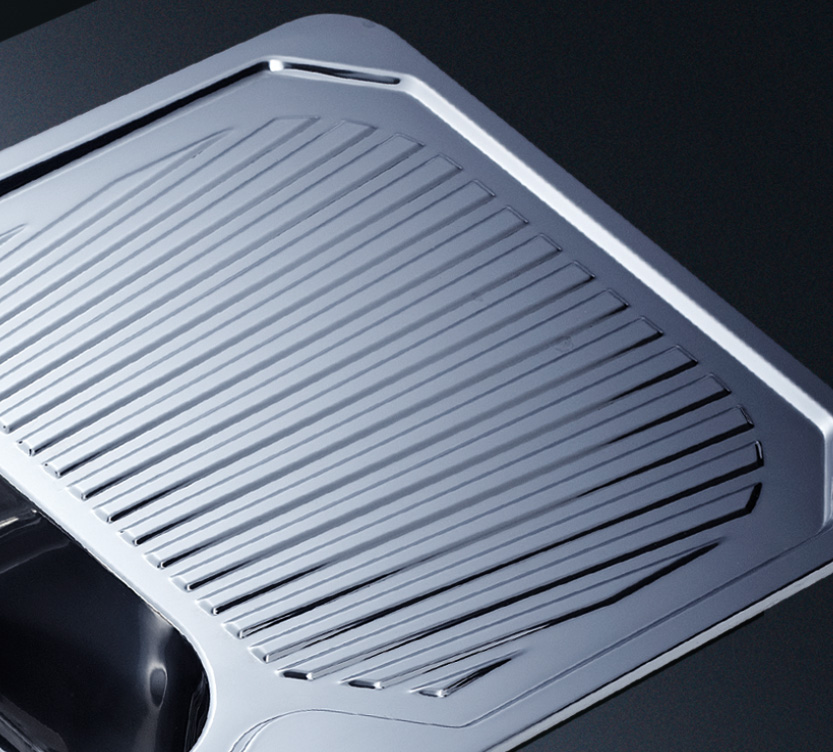 水槽四邊條采用一次成型的折彎加強筋工藝,雙倍堅固,承重力更強,解決了普通焊接工藝容易出現的凹點、脫焊、易割手等問題。專業配置的密封條和固定夾,安裝平整度高,不滲水,不松動