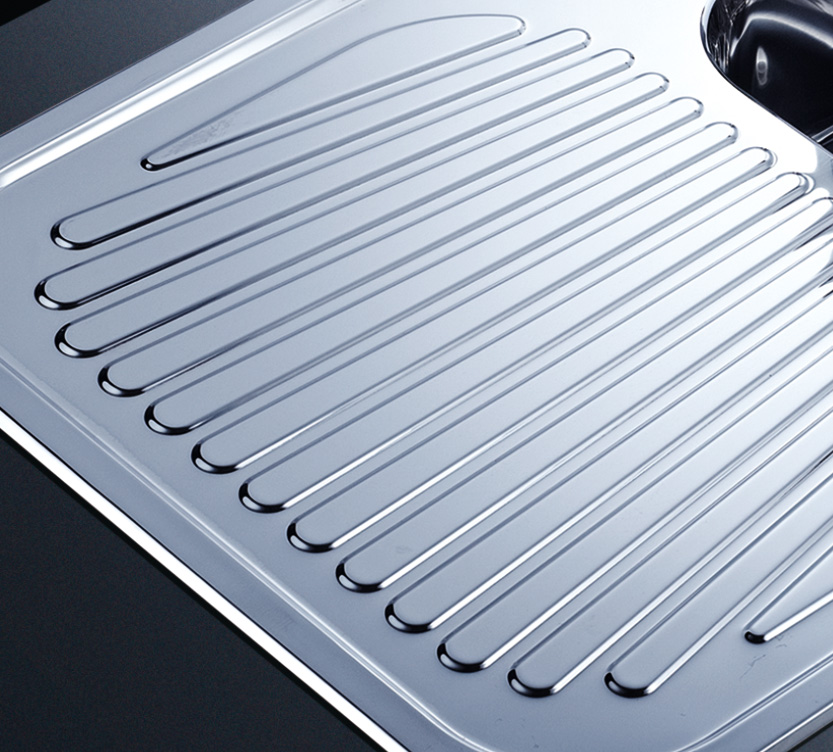 槽底采用斜面壓痕,四輻導流槽設計,與平面壓痕和無痕水槽相比,導水更為流暢,下水更迅速,能有效防止積水,消除沉淀物